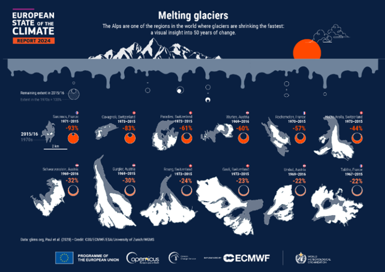 The United Nations have declared 2025 as the International Year of Glaciers’ Preservation. ESOTC 2024 data show that glaciers in all European regions saw a loss of ice. Central Europe is one of the regions in the world where glaciers are shrinking the fastest, and the report includes a compelling infographic representing how much glaciers in the Alps have changed since the 1970s.